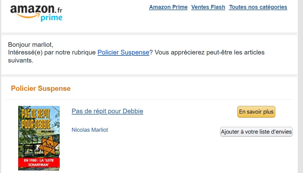 Un petit clin d’oeil amusant : quand tu reçois un mail d’Amazon qui pense que tu pourrais être intéressé par… tes propres polars !