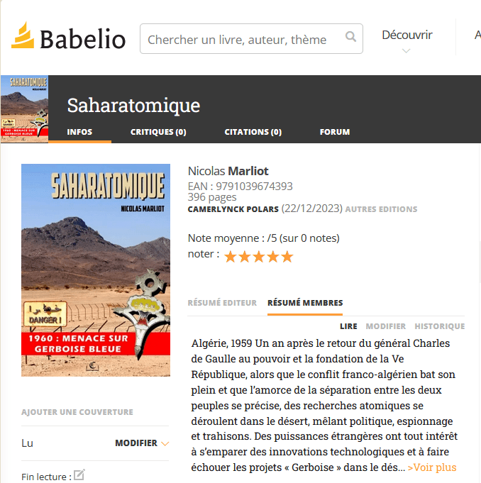 Saharatomique est disponible à la vente, et référencé sur Babelio