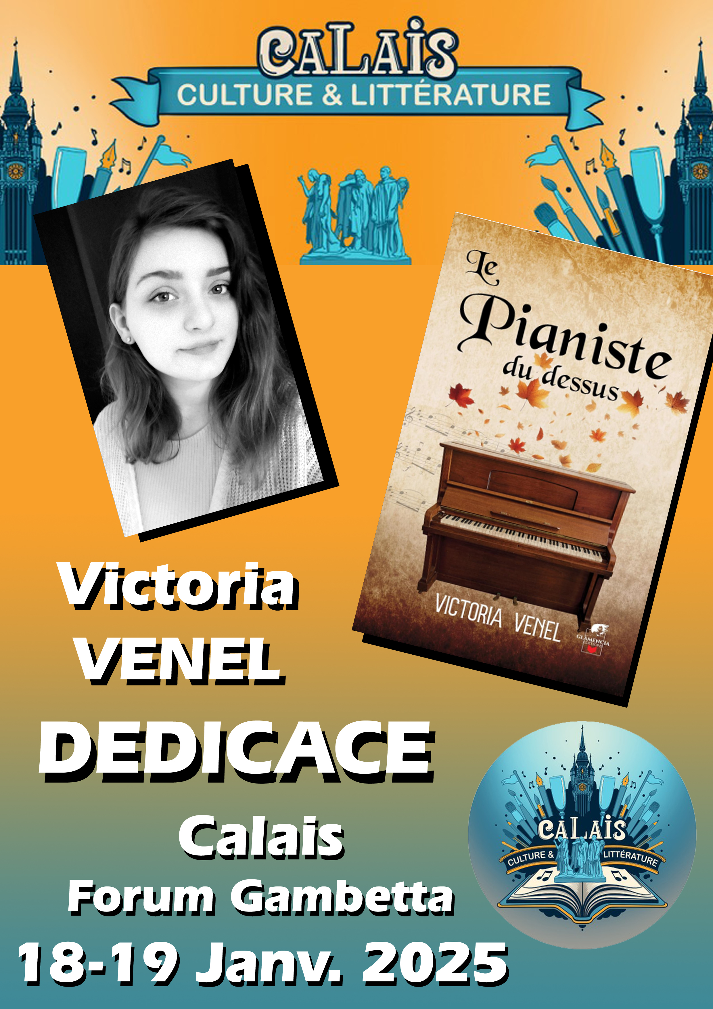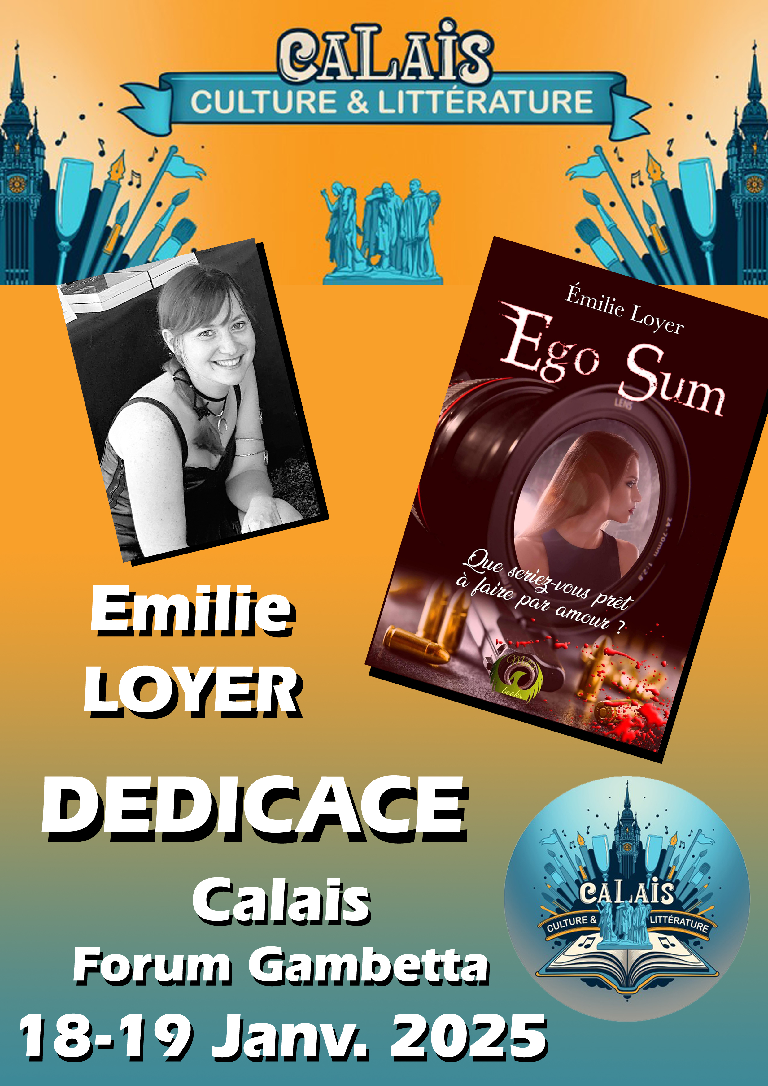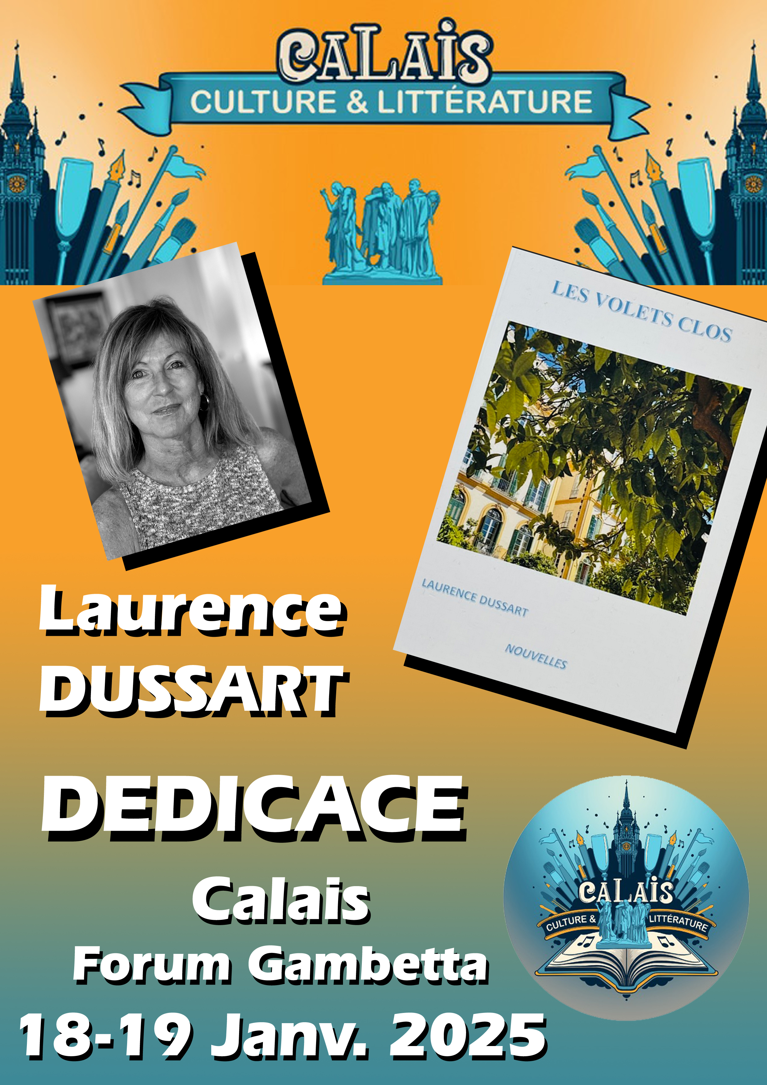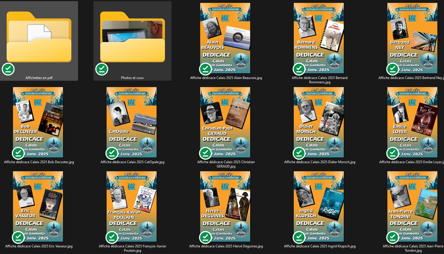 En plus de la participation en tant qu’auteur au second salon du livre des auteurs calaisiens en janvier 2025, l’exercice est de créer les affichettes destinées à chacun des écrivains, pour leur communication sur les réseaux sociaux pour les deux mois qui viennent. C’est ainsi que, cette année encore, chacun des participants peut bénéficier de son propre document.