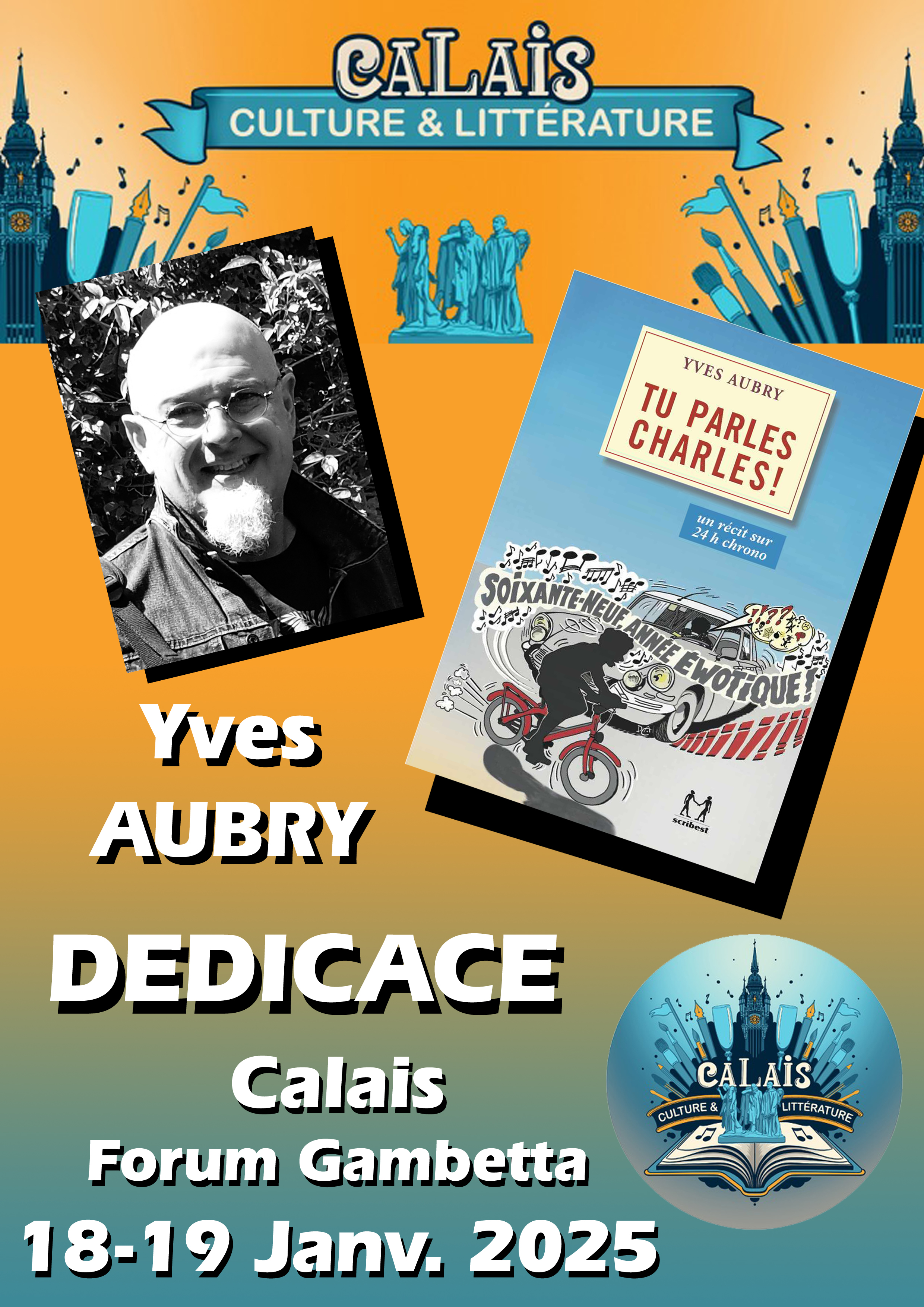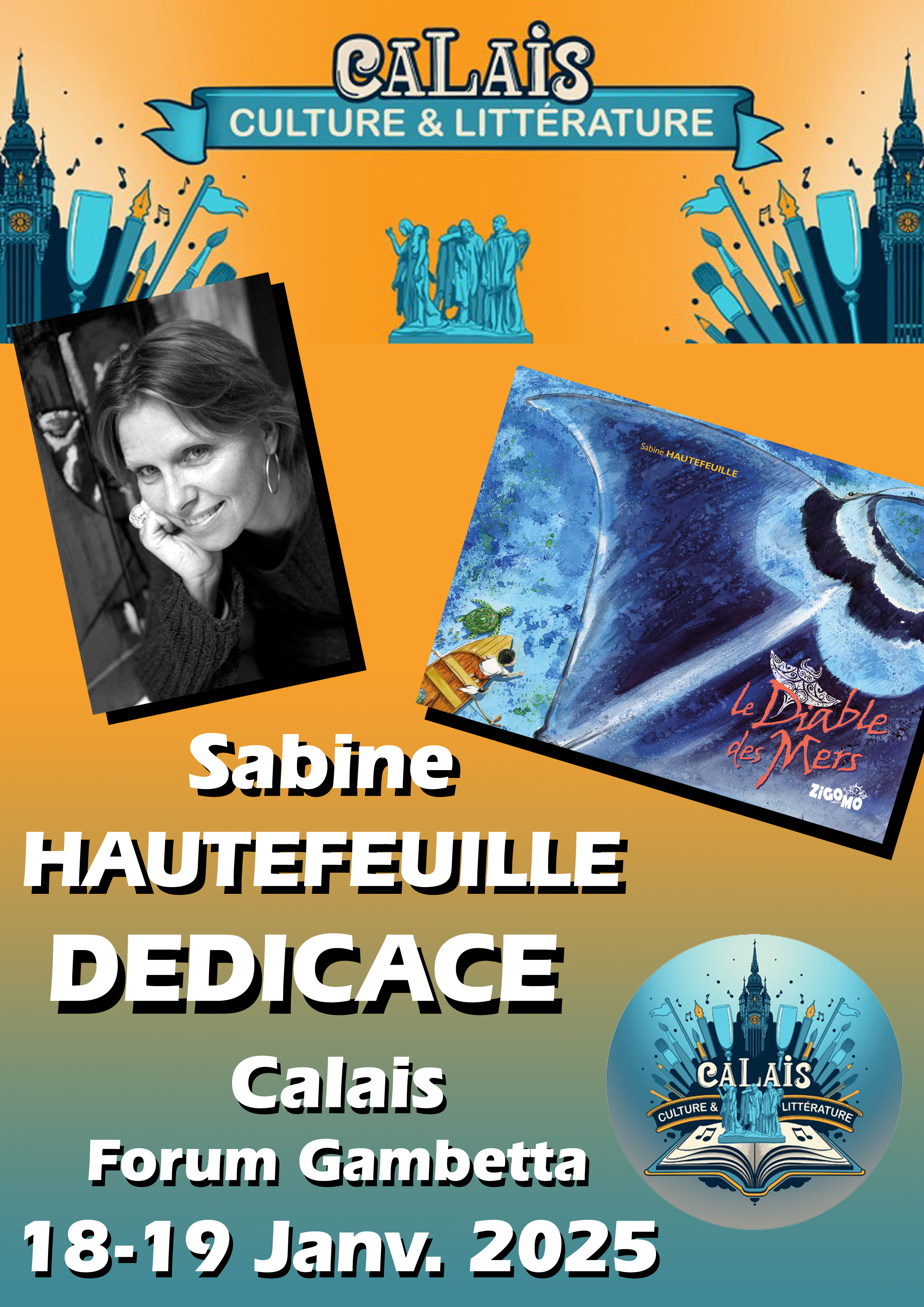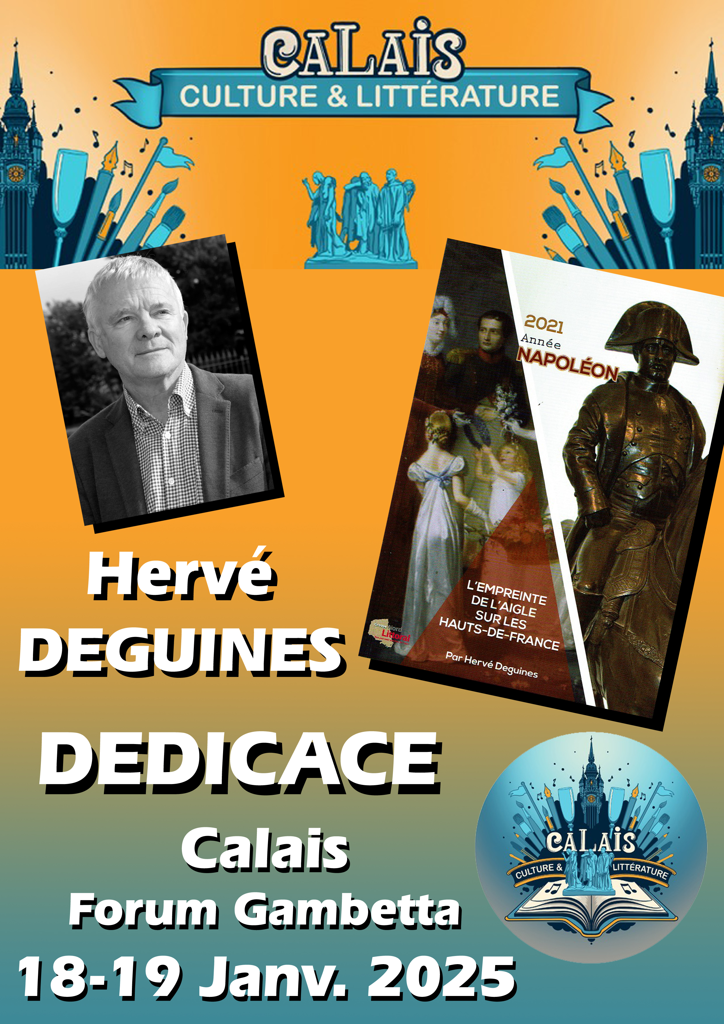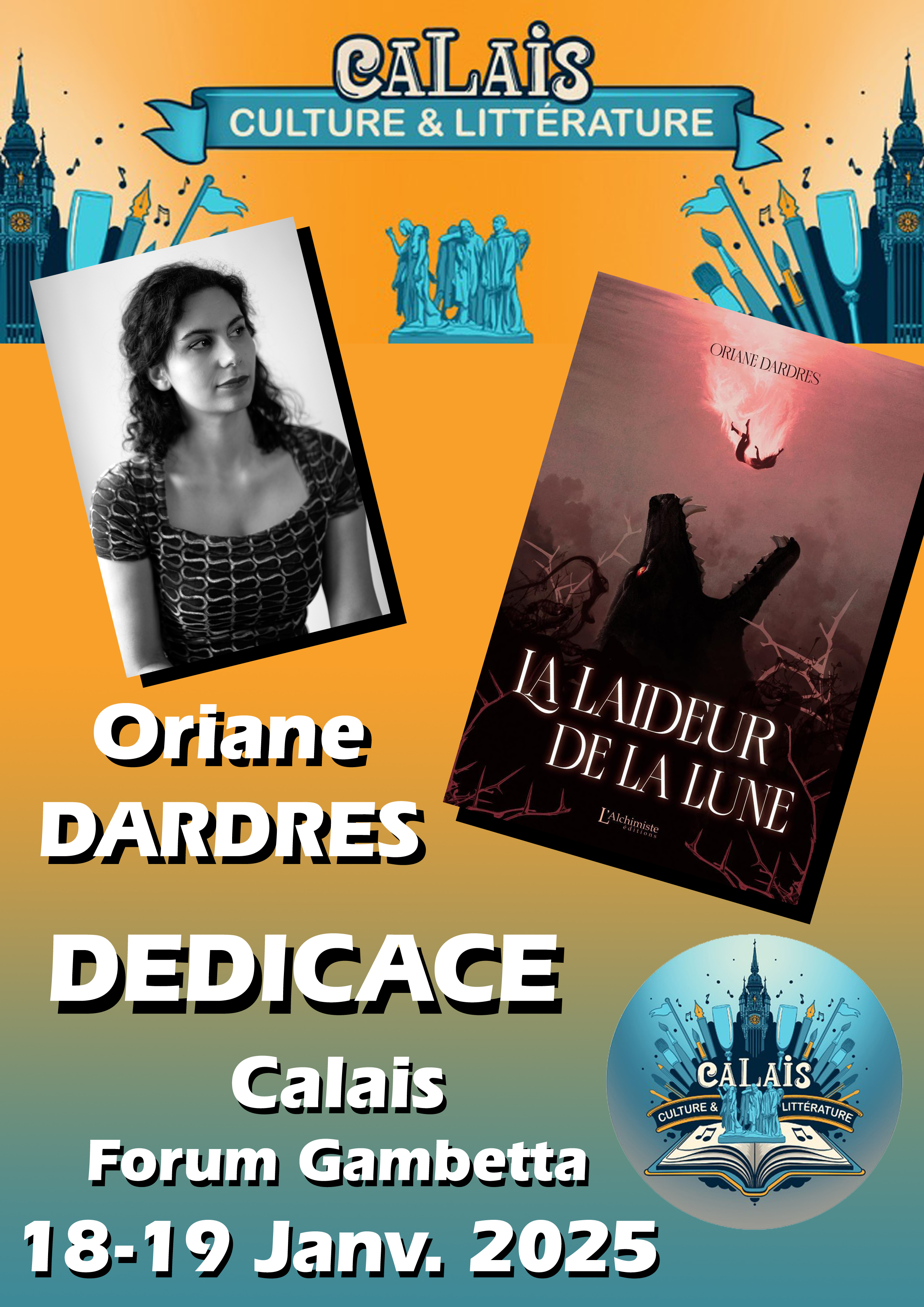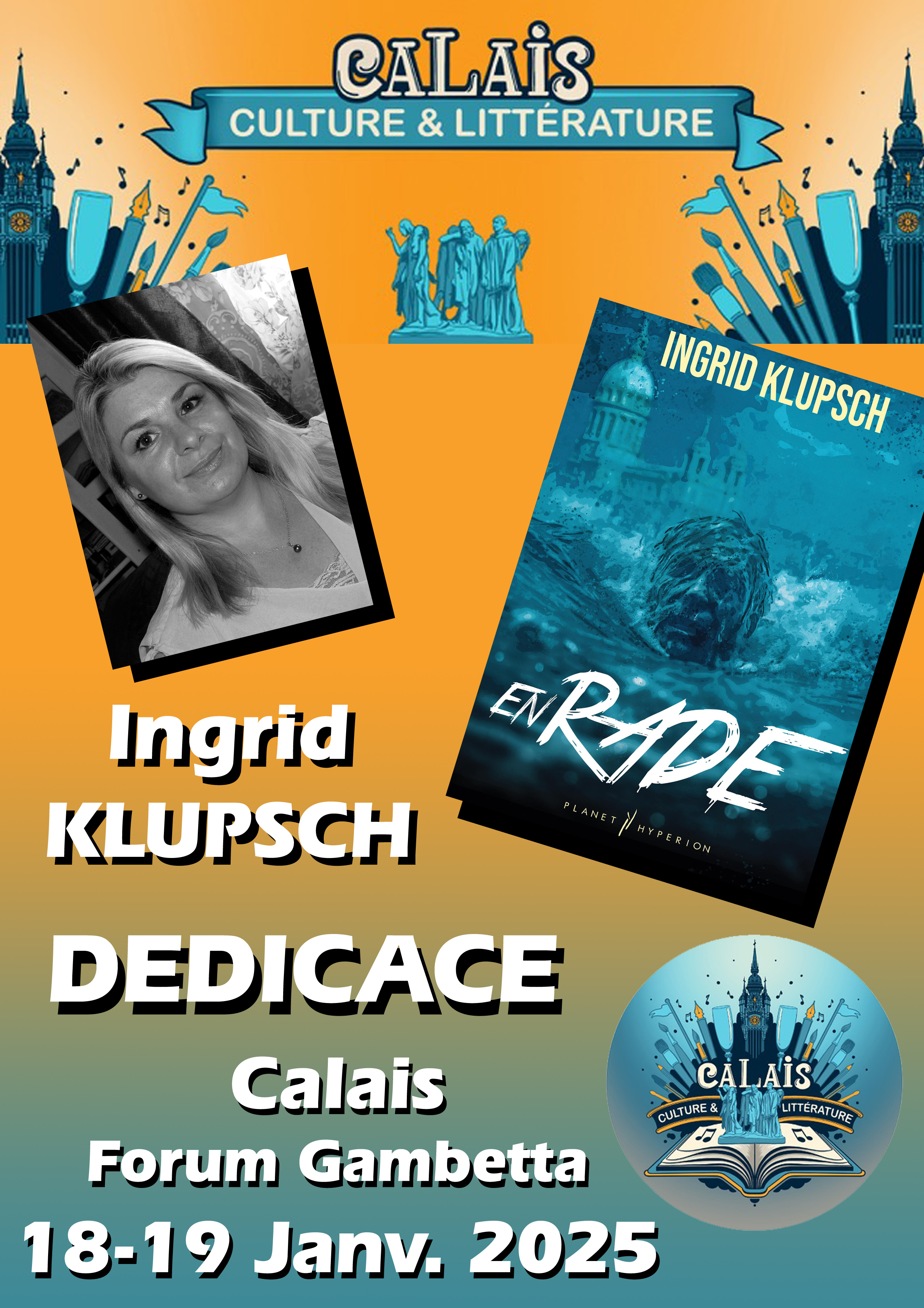 En plus de la participation en tant qu’auteur au second salon du livre des auteurs calaisiens en janvier 2025, l’exercice est de créer les affichettes destinées à chacun des écrivains, pour leur communication sur les réseaux sociaux pour les deux mois qui viennent. C’est ainsi que, cette année encore, chacun des participants peut bénéficier de son propre document.