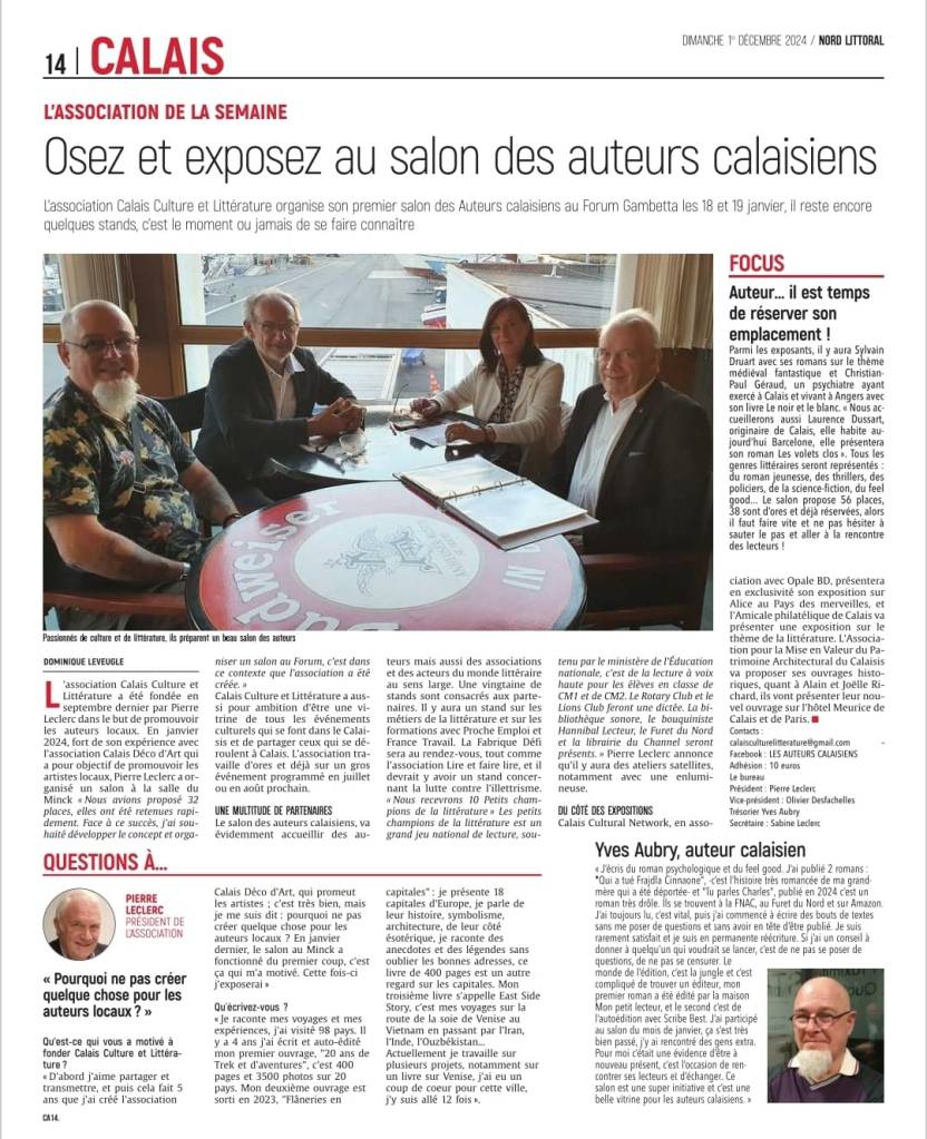 Ce matin, un bel article de Nord-Littoral qui met en valeur l’édition 2025 du salon du livre organisé par la jeune association « Calais Culture et Littérature », second en date après un premier essai réussi en janvier 2024.