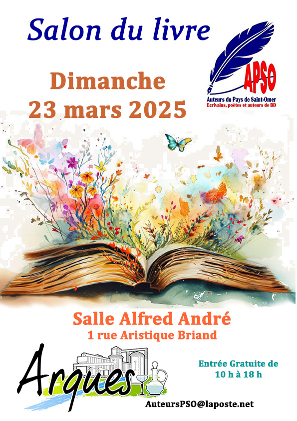 Prochain salon en préparation, celui qui se déroulera à Arques, le dimanche 23 mars, organisé par l’association APSO (Auteurs du Pays de Saint-Omer) que je viens de rejoindre. Avec un peu d’effort, j’ai bon espoir d’avoir terminé les corrections de mon prochain polar qui se déroulera justement à Saint-Omer en 1953, en pleine guerre froide !