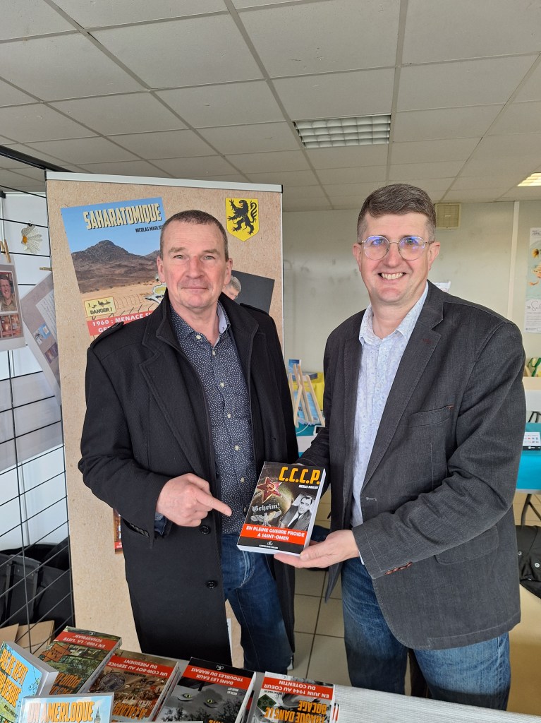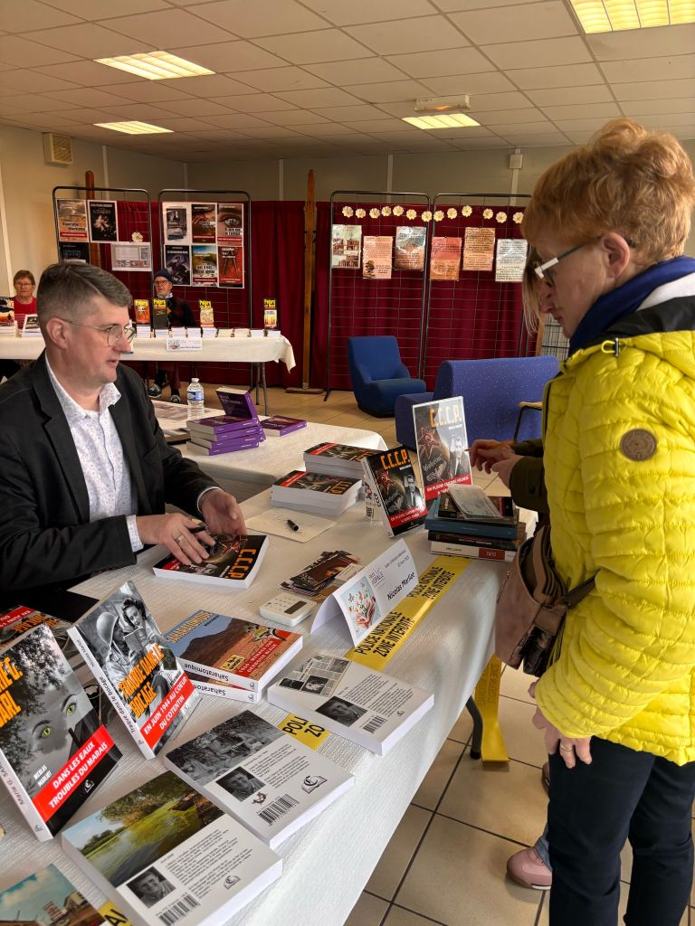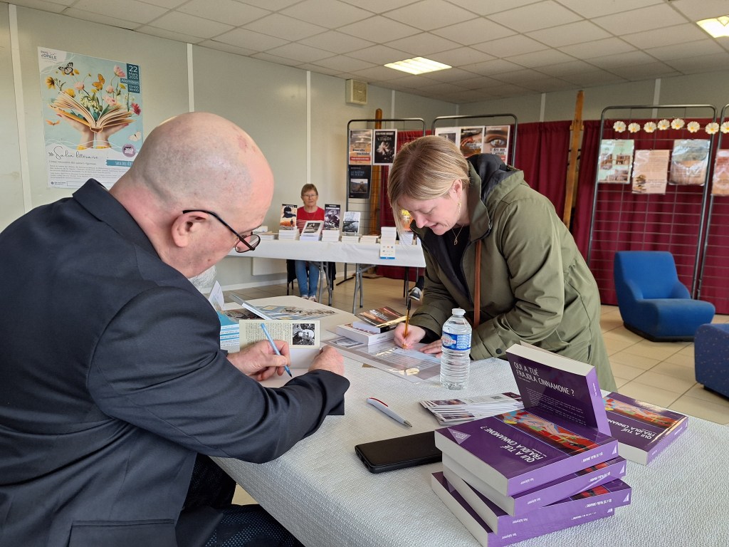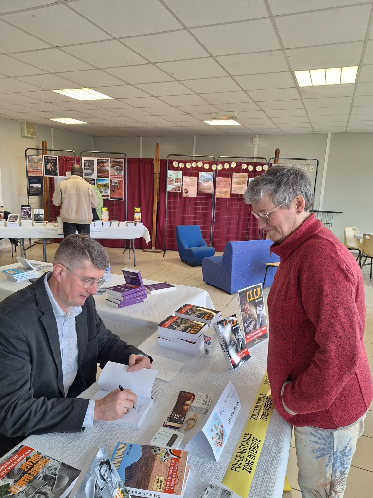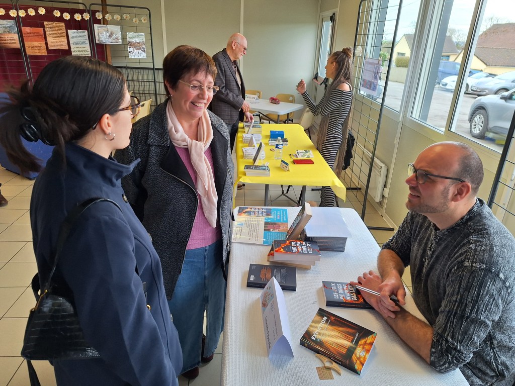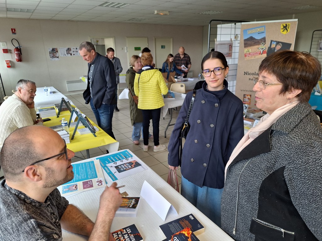 Alembon c’est un tout petit patelin, perdu dans la campagne licquoise, et on n’y vient pas par hasard. Pourtant, c’est la 3e année consécutive que la médiathèque d’Alembon organise un fort sympathique salon, à taille humaine (pas plus d’une quinzaine d’auteurs), avec un accueil formidable (petit déj, repas partagé) et une grande sollicitude des deux Sandrine organisatrices. Pas forcément des centaines de visiteurs, mais les gens qui viennent avaient envie d’acheter des livres et de parler aux auteurs. Sans compter la possibilité pour les auteurs d’échanger tranquillement entre eux (on m’a parlé d’un « gang d’Alembon » qui se serait formé, avec Karine, Laurent, Hubert, Yves et moi-même, et dont on risque d’entendre parler à l’avenir !) et de faire des plans sur la comète.